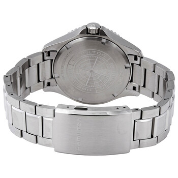 Stainless steel case with a stainless steel bracelet. Uni-directional rotating stainless steel bezel with a blue and white ring. Blue dial with luminous silver-tone dauphine-style hands and index hour markers. 24 hour markers. Minute markers around the outer rim. Dial Type: Analog. Luminescent hands and markers. Date display between the 4 and 5 o'clock positions. Hamilton calibre H-10 automatic movement, based upon ETA C07.111, containing 25 Jewels, bitting at 21600 vph, and has a power reserve of approximately 80 hours. Scratch resistant sapphire crystal. Screw down crown. Solid case back. Round case shape. Cse size: 40 mm. Case thickness: 12.95 mm. Band width: 20 mm. Fold over clasp with a push button release. Water resistant at 100 meters / 330 feet. Functions: date, hour, minute, second. Khaki Navy Scuba Series. Dive watch style. Watch label: Swiss Made. Hamilton Khaki Navy Scuba Automatic Blue Dial Men's Watch H82345141.
