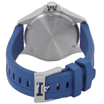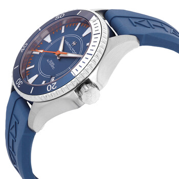 Silver-tone stainless steel case with a blue rubber strap. Blue stainless steel bezel. Blue dial with silver-tone hands and index hour markers. Minute markers around the outer rim. Dial Type: Analog. Luminescent hands and markers. Date display between 4 and 5 o'clock position. Hamilton Calibre H-10 Automatic movement, based upon ETA C07.111, containing 25 Jewels, bitting at 21600 vph, and has a power reserve of approximately 80 hours. Scratch resistant sapphire crystal. Screw down crown. Round case shape, case size: 40 mm. Buckle clasp. Water resistant at 100 meters / 330 feet. Functions: date, hour, minute, second. Khaki Navy Scuba Series. Dive watch style. Watch label: Swiss Made. Hamilton Khaki Navy Scuba Automatic Blue Dial Men's Watch H82385340.