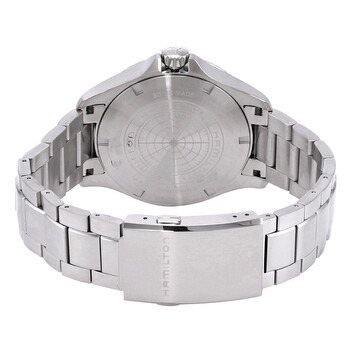 Stainless steel case with a stainless steel bracelet. Uni-directional rotating stainless steel bezel with an inlaid blue ceramic ring. Blue dial with luminous silver-tone hands and index hour markers. 24 hour markers. Minute markers around the outer rim. Dial Type: Analog. Luminescent hands and markers. Hamilton Calibre H-10 Automatic movement, based upon ETA C07.111, containing 25 Jewels, bitting at 21600 vph, and has a power reserve of approximately 80 hours. Scratch resistant sapphire crystal. Screw down crown. Transparent case back. Round case shape. Case size: 43 mm. Fold over clasp. Water resistant at 300 meters / 1000 feet. Functions: hour, minute, second. Khaki Navy Scuba Series. Dive watch style. Watch label: Swiss Made. Hamilton Khaki Navy Scuba Automatic Blue Dial Men's Watch H82505140.