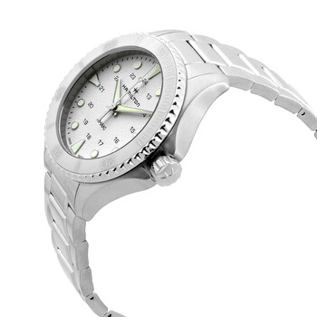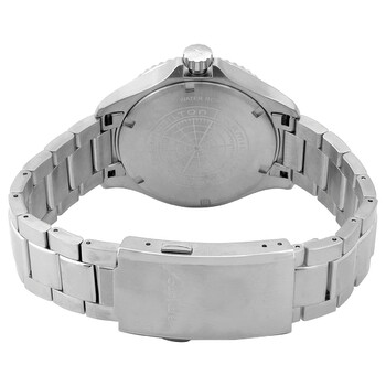 Stainless steel case with a stainless steel bracelet. Uni-directional rotating stainless steel bezel with an inlaid white ceramic ring. White dial with luminous silver-tone hands and dot hour markers. 24 hour markers. Minute markers around the outer rim. Dial Type: Analog. Luminescent hands and markers. Caliber F06.105 quartz movement. Scratch resistant sapphire crystal. Pull / push crown. Solid case back. Round case shape. Case size: 37 mm. Case thickness: 10.77 mm. Band width: 18 mm. Fold over clasp. Water resistant at 100 meters / 330 feet. Functions: hour, minute, second, mi;litary. Khaki Navy Scuba Series. Casual watch style. Watch label: Swiss Made. Hamilton Khaki Navy Scuba Quartz White Dial Unisex Watch H82221110.