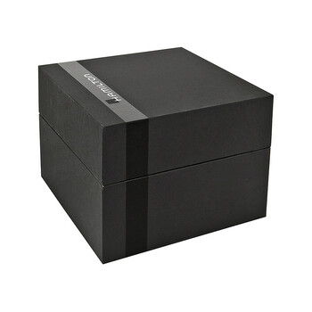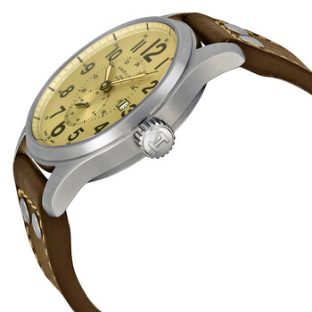 Stainless steel case with a brown leather strap. Fixed stainless steel bezel. Tan dial with luminous hands and Arabic numeral hour markers. Minute markers. 24 hour (GMT) scale around the inner ring. Luminescent hands and markers. Date display appears at the 3 o'clock position. Seconds sub-dial above the 6 o'clock position. Automatic movement. Scratch resistant sapphire crystal. Steel crown. Skeleton case back. Case diameter: 44 mm. Tang clasp. Water resistant at 100 meters/ 330 feet. Functions: hours, minutes, seconds, date. Hamilton Khaki Officer Men's Watch H70655723.