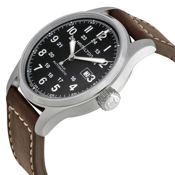 Stainless steel case with a brown leather strap. Fixed stainless steel bezel. Black dial with luminous hands and Arabic numeral hour markers. 24 hour markers around an inner ring. Minute markers around the outer rim. Dial Type: Analog. Luminescent hands and markers. Date display at the 3 o'clock position. Hamilton calibre H-10 automatic movement, based upon ETA C07.111, containing 25 Jewels, bitting at 21600 vph, and has a power reserve of approximately 80 hours. Scratch resistant sapphire crystal. Skeleton case back. Round case shape. Case size: 44.5 mm. Case thickness: 11 mm. Band width: 22 mm. Band length: 8.5 inches. Tang clasp. Water resistant at 100 meters / 330 feet. Functions: date, hour, minute, second. Casual watch style. Watch label: Swiss Made. Hamilton Khaki Officers Automatic Black Dial Men's Watch H70625533.