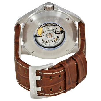 Stainless steel case with a brown leather strap. Fixed stainless steel bezel. Grey dial with luminous hands and Arabic numeral hour markers. Arabic numeral minute markers (at 5 minute intervals). Minute markers around the outer rim. Dial Type: Analog. Luminescent hands and markers. Day of the week and date display at the 3 o'clock position. Hamilton calibre H-30 automatic movement, based upon ETA C07.111, containing 25 Jewels, bitting at 21600 vph, and has a power reserve of approximately 80 hours. Scratch resistant sapphire crystal. Screw down crown. Screw in skeleton case back. Round case shape. Case size: 46 mm. Case thickness: 12 mm. Band width: 22 mm. Tang clasp. Water resistant at 200 meters / 660 feet. Functions: date, day, hour, minute, second. Khaki Series. Pilot watch style. Watch label: Swiss Made. Hamilton Khaki Pilot Automatic Men's Watch H64715885.
