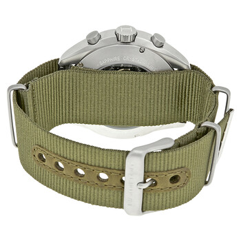 Stainless steel case with a khaki canvas strap. Fixed stainless steel bezel. Ivory dial with luminous black hands and Arabic numeral hour markers. Minute markers around the outer rim. Dial Type: Analog. Luminescent hands and markers. Date display between the 4 and 5 o'clock positions. Chronograph - two sub-dials displaying: 60 second and 30 minute. Hamilton calibre H-31 automatic movement with a 60-hour power reserve. Scratch resistant sapphire crystal. Skeleton case back. Case size: 42 mm. Case thickness: 16 mm. Round case shape. Band width: 22 mm. Band length: 8 inches. Tang clasp. Water resistant at 100 meters / 330 feet. Functions: chronograph, date, hour, minute, second. Casual watch style. Watch label: Swiss Made. Hamilton Khaki Pilot Pioneer Automatic Chronograph Ivory Dial Men's Watch H76456955.