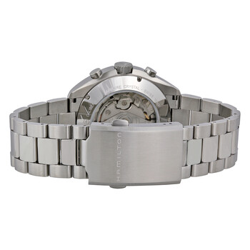 Stainless steel case with a stainless steel bracelet. Fixed stainless steel bezel. Ivory dial with luminous hands and Arabic numeral hour markers. Minute markers around the outer rim. Dial Type: Analog. Luminescent hands and markers. Date display between the 4 and 5 o'clock positions. Chronograph - two sub-dials displaying: 60 second and 30 minute. Hamilton calibre H-31 automatic movement, based upon ETA 7753, containing 27 Jewels, bitting at 28800 vph, and has a power reserve of approximately 60 hours. Scratch resistant sapphire crystal. Screw down crown. Transparent case back. Round case shape. Case size: 41 mm. Case thickness: 17 mm. Band width: 20 mm. Fold over clasp with a push button release. Water resistant at 100 meters / 330 feet. Functions: chronograph, date, hour, minute, second. Khaki Pilot Pioneer Series. Pilot watch style. Watch label: Swiss Made. Hamilton Khaki Pilot Pioneer Chronograph Automatic Ivory Dial Men's Watch H76416155.