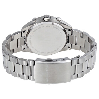 Stainless steel case with a stainless steel bracelet. Fixed stainless steel bezel. Black dial with luminous silver-tone hands and Arabic numeral hour markers. Minute markers around the outer rim. Dial Type: Analog. Luminescent hands and markers. Date display at the 3 o'clock position. Chronograph - two sub-dials displaying: 60 second and 30 minute. ETA caliber G10.211 quartz movement. Scratch resistant sapphire crystal. Pull / push crown. Solid case back. Case size: 41 mm. Case thickness: 13 mm. Round case shape. Band width: 22 mm. Band length: 7.5 inches. Deployment clasp with a push button release. Water resistant at 100 meters / 330 feet. Functions: chronograph, date, hour, minute, second. Dress watch style. Watch label: Swiss Made. Hamilton Khaki Pilot Pioneer Chronograph Men's Watch H76512133.