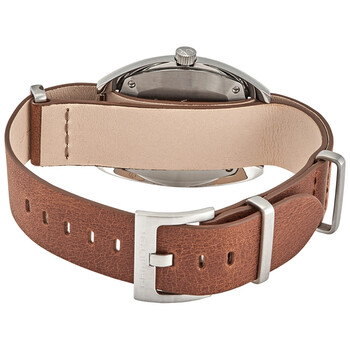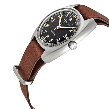 Stainless steel case with a brown leather strap. Fixed stainless steel bezel. Black dial with luminous silver-tone hands and Arabic numeral hour markers. Minute markers around the outer rim. Dial Type: Analog. Luminescent hands and markers. Hamilton calibre H-50 hand wind movement, based upon ETA 2801-2, containing 17 Jewels, bitting at 21600 vph, and has a power reserve of approximately 80 hours. Scratch resistant mineral crystal. Pull / push crown. Solid case back. Round case shape. Case dimensions: 36 mm x 33 mm. Case thickness: 9.95 mm. Band width: 18 mm. Tang clasp. Water resistant at 100 meters / 330 feet. Functions: hour, minute, second. Pilot watch style. Watch label: Swiss Made. Hamilton Khaki Pilot Pioneer Hand Wind Black Dial Men's Watch H76419531.
