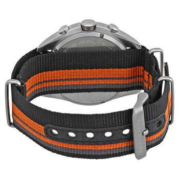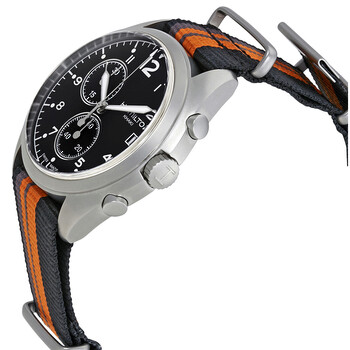 Stainless steel case with a striped nylon NATO strap. Fixed stainless steel bezel. Black dial with luminous silver-tone hands and Arabic numeral hour markers. Minute markers around the outer rim. Dial Type: Analog. Luminescent hands and markers. Date display at the 3 o'clock position. Two sub-dials displayings: 60 seconds and 30 minutes. Quartz movement. Scratch resistant sapphire crystal. Solid case back. Case diameter: 41 mm. Case thickness: 13 mm. Round case shape. Band width: 22 mm. Tang clasp. Water resistant at 100 meters / 330 feet. Casual watch style. Hamilton Khaki Pioneer Pilot Black Dial Men Watch H76552933.