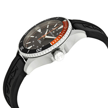 Stainless steel case with a black rubber strap. Uni-directional rotating stainless steel bezel with a black and orange aluminium ring. Black dial with luminous silver-tone dauphine-style hands and index hour markers. 24 hour markers. Minute markers around the outer rim. Dial Type: Analog. Luminescent hands and markers. Date display between the 4 and 5 o'clock positions. Hamilton calibre H-10 automatic movement, based upon ETA C07.111, containing 25 Jewels, bitting at 21600 vph, and has a power reserve of approximately 80 hours. Scratch resistant sapphire crystal. Screw down crown. Solid case back. Round case shape. Case size: 40 mm. Case thickness: 12.95 mm. Band width: 20 mm. Tang clasp. Water resistant at 100 meters / 330 feet. Functions: date, hour, minute, second. Khaki Scuba Series. Casual watch style. Watch label: Swiss Made. Hamilton Khaki Scuba Automatic Black Dial Men's Watch H82305331.
