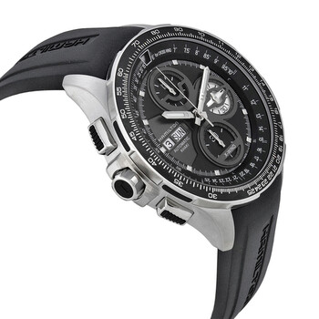 Stainless steel case with a black rubber strap. Bi-directional rotating stainless steel bezel with a black inlay. Black dial with luminous silver-tone hands and index hour markers. Minute markers. Cross wind markings around the outer rim. Dial Type: Analog. Luminescent hands and markers. Day of the week and date display at the 9 o'clock position. Chronograph - three sub-dials displaying: 60 second, 30 minute and 12 hour. Hamilton calibre H-21 automatic movement with a 60-hour power reserve. Scratch resistant sapphire crystal. Screw down crown. Partial skeleton case back. Round case shape, case size: 45 mm, case thickness: 16 mm. Band width: 22 mm. Tang clasp. Water resistant at 100 meters / 330 feet. Functions: chronograph, cross wind, date, day, hour, minute, second. Casual watch style. Watch label: Swiss Made. Hamilton Khaki X-Wind Chronograph Automatic Men's Watch H77766331.