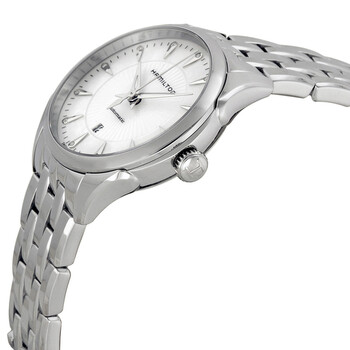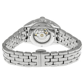 Stainless steel case with a stainless steel bracelet. Fixed stainless steel bezel. Mother of pearl dial with silver-tone hands and diamond-tipped index hour markers. Minute markers around the outer rim. Dial Type: Analog. Luminescent hands and markers. Date display at the 6 o'clock position. Automatic movement wtih a 38-hour power reserve. Scratch resistant sapphire crystal. Pull / push crown. Transparent case back. Case diameter: 30 mm. Case thickness: 7 mm. Round case shape. Band width: 16 mm. Deployment clasp with a push button releae . Water resistant at 50 meters / 165 feet. Functions: date, hour, minute, second. Dress watch style. Watch label: Swiss Made. Hamilton Lady Auto Mother of Pearl Dial Stainless Steel Ladies Watch H42215111.
