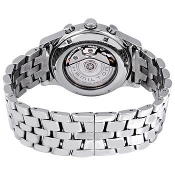Stainless steel case with a stainless steel bracelet. Fixed stainless steel bezel. Black dial with silver-tone hands and index hour markers. Minute markers around the outer rim. Dial Type: Analog. Day of the week and date display at the 3 o'clock position. Chronograph - three sub-dials displaying: 60 second, 30 minute and 12 hours. Automatic movement. Scratch resistant sapphire crystal. Pull / push crown. Transparent case back. Round case shape. Case size: 38 mm. Case thickness: 15 mm. Band width: 18 mm. Band length: 8 inches. Double fold over clasp. Water resistant at 50 meters / 165 feet. Functions: chronograph, date, day, hour, minute, second. Casual watch style. Hamilton Linwood Chronograph Automatic Black Dial Men's Watch H18516131.