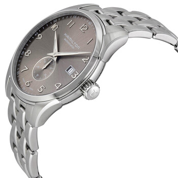 Stainless steel case with a stainless steel bracelet. Fixed stainless steel bezel. Grey dial with luminous silver-tone hands and Arabic numeral hour markers. Minute markers around the outer rim. Dial Type: Analog. Luminescent hands and markers. Date display at the 3 o'clock position. Seconds sub-dial above the 6 o'clock position. ETA caliber 2895-2 automatic movement with a 42-hour power reserve. Scratch resistant mineral crystal. Pull / push crown. Transparent case back. Round case shape. Case size: 40 mm. Case thickness: 11.5 mm. Band width: 20 mm, band length: 7.5 inches. Fold over clasp with a safety release. Water resistant at 50 meters / 165 feet. Functions: date, hour, minute, small second. Casual watch style. Watch label: Swiss Made. Hamilton Maestro Automatic Grey Dial Stainless Steel Watch H42515185.