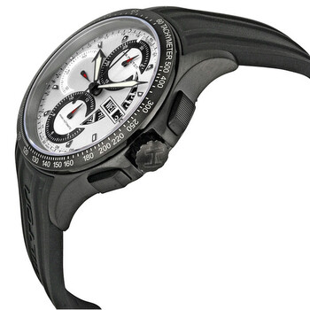 Black stainless steel case with a black rubber strap. Fixed with engraved tachometer black stainless steel bezel. Silver dial with luminous hands and stick hour markers. Dial Type: Analog. Luminescent hands and dial markers. Day and date display at the 3 o'clock position. Chronograph - three sub-dials displaying: 60 second, 30 minute and 12 hour. ETA-Valjoux Caliber 7750 Automatic movement, containing 25 Jewels, bitting at 28800 vph, and has a power reserve of approximately 44 hours. Scratch resistant sapphire crystal. Screw down crown. Screw down skeleton case back. Round case shape, case size: 44 mm. Band length: 8.5 inches. Deployment clasp. Water resistant at 100 meters / 330 feet. Functions: hours/ minutes/ seconds/ chronograph/ tachometer. Khaki King Series. Sport watch style. Watch label: Swiss Made. Item Variations: H64656351. Hamilton Men's Khaki King X-Mach Automatic Watch with Silver Dial H64656351.