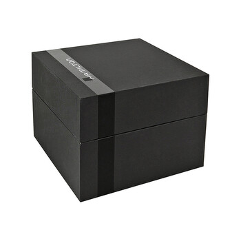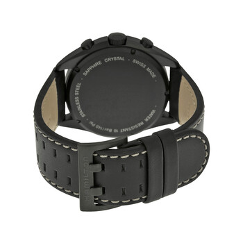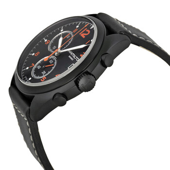 Black PVD stainless steel case with a black leather strap. Fixed black PVD bezel. Black dial with orange and silver-tone hands and orange Arabic numeral hour markers. Minute markers around the outer rim. Dial Type: Analog. Luminescent hands and markers. Date display at the 3 o'clock position. Chronograph - two sub-dials displaying: 60 second and 30 minute. Quartz movement. Scratch resistant sapphire crystal. Pull / push crown. Solid case back. Case diameter: 41 mm. Case thickness: 13 mm. Round case shape. Tang clasp. Water resistant at 100 meters / 330 feet. Functions: chronograph, date, hour, minute, second. Casual watch style. Watch label: Swiss Made. Hamilton Pilot Pioneer Chronograph Black Dial Black Leather Men's Watch H76582733.