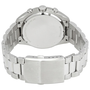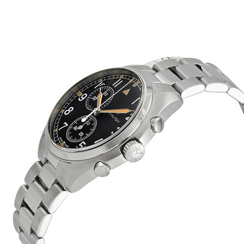Stainless steel case with a stainless steel bracelet. Fixed stainless steel bezel. Black dial with luminous silver-tone hands and Arabic numeral hour markers. Minute markers around the outer rim. Dial Type: Analog. Luminescent hands and markers. Chronograph - two sub-dials displaying: 60 second and 30 minute. Caliber G10.211 quartz movement. Scratch resistant sapphire crystal. Solid case back. Round case shape. Case size: 41 mm. Case thickness: 12.47 mm. Band width: 22 mm. Fold over clasp with a push button release. Water resistant at 100 meters / 330 feet. Functions: chronograph, hour, minute, second. Pilot watch style. Watch label: Swiss Made. Hamilton Pilot Pioneer Chronograph Quartz Black Dial Men's Watch H76522131.