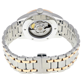 Stainless steel case with a two-tone (silver and rose gold-plated) stainless steel bracelet. Fixed rose gold-plated bezel. Silver dial with rose gold-tone hands and index hour markers. Minute markers. Arabic numeral minute markers (at 5 minute intervals) around the outer rim. Dial Type: Analog. Date display at the 3 o'clock position. Small seconds sub-dial at the 8 o'clock position. Automatic movement with a 42-hour power reserve. Scratch resistant sapphire crystal. Skeleton case back. Case diameter: 42 mm. Case thickness: 13.25 mm. Round case shape. Band width: 22 mm. Deployment clasp. Water resistant at 100 meters / 330 feet. Functions: date, hour, minute, second. Dress watch style. Watch label: Swiss Made. Hamilton Railroad Small Second Silver Dial Two-tone Steel Men's Watch H40525151.