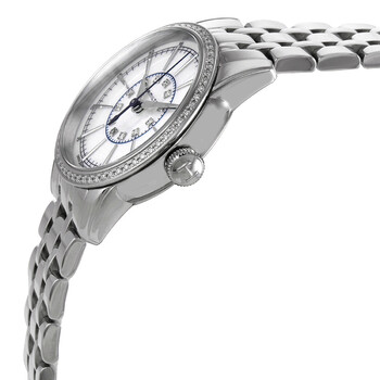 Stainless steel case with a stainless steel bracelet. Fixed stainless steel bezel set with diamonds. White mother of pearl dial with blue hands and diamond-tipped index hour markers. Minute markers. Arabic numeral minute markers (at 5 minute intervals) around the outer rim. Dial Type: Analog. ETA caliber F03.101 quartz movement. Scratch resistant sapphire crystal. Pull / push crown. Solid case back. Round case shape. Case size: 28 mm. Case thickness: 8 mm. Band width: 14 mm. Fold over clasp with a push button release. Water resistant at 50 meters / 165 feet. Functions: hour, minute, second. Additional Info: 60 diamonds on bezel. Railroad Series. Luxury watch style. Watch label: Swiss Made. Hamilton Railroad White Mother of Pearl Dial Stainless Steel Ladies Watch H40391191.