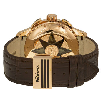 Rose gold-tone stainless steel case with a brown crocodile leather strap. Fixed rose gold-tone bezel. Wood grain brown patterned dial with rose gold-tone hands and rose gold-tone index hour markers. Minute markers around the outer rim. Dial Type: Analog. Date display between 4 and 5 o'clock positions. Chronograph - three sub-dials displaying: 60 second, 60 minute and 1/10th of a second. Automatic movement. Scratch resistant sapphire crystal. Pull / push crown. Snap-down case back. Case diameter: 44 mm. Case thickness: 16 mm. Round case shape. Band width: 22 mm. Band length: 8 inches. Fold over clasp with safety release. Water resistant at 100 meters / 330 feet. Functions: chronograph, date, hour, minute, second. Dress watch style. Watch label: Swiss Made. Hamilton Rose Gold-tone Auto Chronograh Men's Watch H34646591.