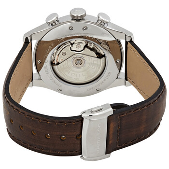 Stainless steel case with a brown (calfskin) leather strap. Fixed stainless steel bezel. Blue dial with silver-tone leaf-style hands and index hour markers. Minute markers around the outer rim. Dial Type: Analog. Date display at the 3 o'clock position. Chronograph - two sub-dials displaying: 30 minute and 12 hour. Hamilton calibre H-21 automatic movement, based upon ETA 7750, containing 25 Jewels, bitting at 28800 vph, and has a power reserve of approximately 60 hours. Scratch resistant sapphire crystal. Transparent case back. Round case shape. Case size: 42 mm. Case thickness: 15 mm. Band width: 22 mm. Deployment clasp. Water resistant at 50 meters / 165 feet. Functions: chronograph, date, day, hour, minute, small second. Spirit Of Liberty Series. Casual watch style. Watch label: Swiss Made. Hamilton Spirit of Liberty Automatic Blue Dial Men's Watch H32416541.
