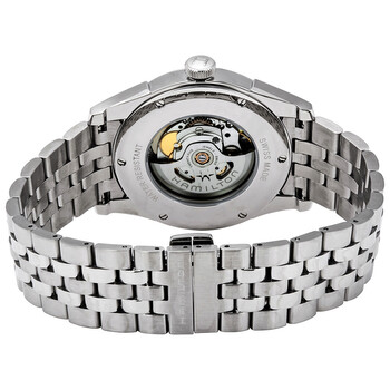 `Stainless steel case with a stainless steel bracelet. Fixed stainless steel bezel. Silver dial with rose gold-tone leaf-style hands and index hour markers. Minute markers around the outer rim. Dial Type: Analog. Date display at the 6 o'clock position. Hamilton calibre H-10 automatic movement, based upon ETA C07.111, containing 25 Jewels, bitting at 21600 vph, and has a power reserve of approximately 80 hours. Scratch resistant sapphire crystal. Pull / push crown. Transparent case back. Round case shape. Case size: 42 mm. Case thickness: 11.4 mm. Band width: 22 mm. Hidden clasp. Water resistant at 50 meters / 165 feet. Functions: date, hour, minute, second. Casual watch style. Watch label: Swiss Made. Hamilton Spirit of Liberty Automatic Silver Dial Men's Watch H42415102.
