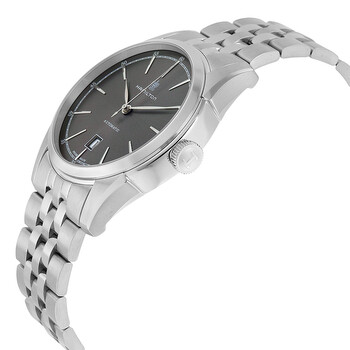 Stainless steel case with a stainless steel bracelet. Fixed stainless steel bezel. Grey dial with silver-tone hands and index hour markers. Minute markers around the outer rim. Dial Type: Analog. Date display at the 6 o'clock position. Hamilton calibre H-10 automatic movement with an 80-hour power reserve. Scratch resistant sapphire crystal. Pull / push crown. Transparent case back. Case size: 42 mm. Case thickness: 11 mm. Round case shape. Band width: 22 mm. Deployment clasp with a push button release. Water resistant at 50 meters / 165 feet. Functions: date, hour, minute, second. Luxury watch style. Watch label: Swiss Made. Hamilton Spirit Of Liberty Grey Dial Men's Watch H42415091.