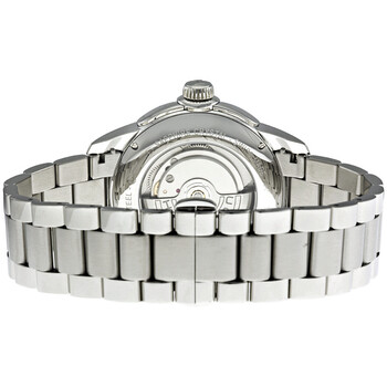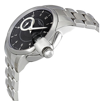 Stainless steel case with a stainless steel link bracelet. Fixed stainless steel bezel. Black dial with silver-tone hands and Arabic numeral hour markers. Minute markers around the outer rim. Dial Type: Analog. Date display appears at the 3 o'clock position. Small seconds sub-dial at the 9 o'clock position. Automatic movement. Scratch resistant sapphire crystal. Push in crown. Skeleton case back. Case diameter: 44 mm. Deployment clasp. Water resistant at 100 meters/ 330 feet. Functions: hours, minutes, seconds, date. Dress watch style. Hamilton Timeless Classic Railroad Black Dial Automatic Men's Watch H40615135.