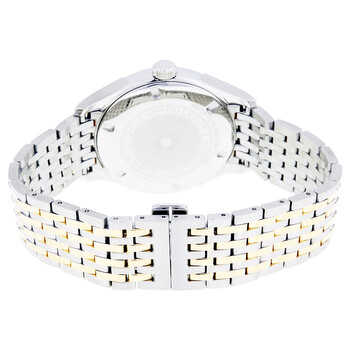 Stainless steel case with a two-tone (silver-tone and rose gold PVD) stainless steel bracelet. Fixed rose gold PVD bezel. White dial with rose gold-tone alpha-style shape hands and Roman numeral hour markers. Minute markers around the outer rim. Dial Type: Analog. Date display at the 3 o'clock position. Hamilton calibre H-10 automatic movement, based upon ETA C07.111, containing 25 Jewels, bitting at 21600 vph, and has a power reserve of approximately 80 hours. Scratch resistant sapphire crystal. Pull / push crown. Solid case back. Round case shape. Case size: 40 mm. Case thickness: 10.41 mm. Band width: 20.3 mm. Band length: 8 inches. Hidden fold over clasp. Water resistant at 50 meters / 165 feet. Functions: date, hour, minute, second. Casual watch style. Watch label: Swiss Made. Hamilton Valiant Automatic White Dial Two-tone Men's Watch H39525214.