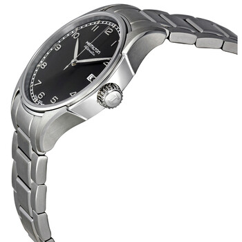 Stainless steel case with a stainless steel link bracelet. Fixed stainless steel bezel. Black dial with silver-tone hands and Arabic numeral hour markers. Minute markers around the outer rim. Date display appears at the 3 o'clock position. Automatic movement. Scratch resistant sapphire crystal. Case diameter: 40 mm. Case thickness: 10 mm. Deployment clasp with push button. Water resistant at 50 meters/ 165 feet. Functions: hours, minutes, seconds, calendar. Hamilton Valiant Black Dial Men's Watch H39515133.
