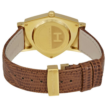 Yellow gold-tone stainless steel case with a brown leather strap. Fixed yellow gold-tone bezel. White dial with yellow gold-tone hands and index hour markers. Dial Type: Analog. ETA Caliber F05.101 quartz movement. Scratch resistant mineral crystal. Pull / push crown. Solid case back. Asymmetric case shape. Case dimensions: 32.3 mm x 50.3 mm. Case thickness: 11 mm. Band width: 17 mm. Butterfly clasp. Water resistant at 50 meters / 165 feet. Functions: hour, minute, second. Casual watch style. Watch label: Swiss Made. Hamilton Ventura White Dial Men's Watch H24301511.