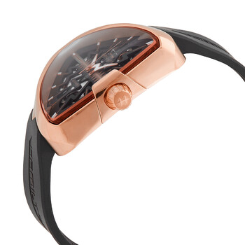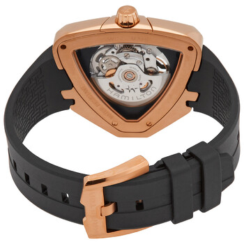 Rose gold-tone stainless steel case with a black rubber strap. Fixed rose gold-tone bezel. Black (cut-out) dial with rose gold-tone hands and index hour markers. Dial Type: Analog. Luminescent hands and markers. Hamilton calibre H-10-S Automatic movement, based upon ETA C07.111, containing 25 Jewels, bitting at 21600 vph, and has a power reserve of approximately 80 hours. Scratch resistant sapphire crystal. Transparent case back. Triangular case shape. Case size: 42.5 mm. Tang clasp. Water resistant at 50 meters / 165 feet. Functions: hour, minute, second. Ventura Series. Sport watch style. Watch label: Swiss Made. Hamilton Ventura Automatic Black Dial Men's Watch H24525331.