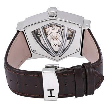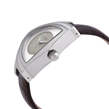 Stainless steel case with a brown (calfskin) leather strap. Fixed stainless steel bezel. Grey dial with silver-tone hands and index hour markers. Minute markers around the outer rim. Dial Type: Analog. Luminescent hands. Hamilton calibre H-10 automatic movement, based upon ETA C07.111, containing 25 Jewels, bitting at 21600 vph, and has a power reserve of approximately 80 hours. Scratch resistant sapphire crystal. Pull / push crown. Transparent case back. Asymmetric case shape. Case dimensions: 34.7 mm x 53.5 mm. Band width: 21 mm. Fold over clasp. Water resistant at 50 meters / 165 feet. Functions: hour, minute, second. Ventura Series. Dress watch style. Watch label: Swiss Made. Hamilton Ventura Automatic Grey Dial Men's Watch H24515581.