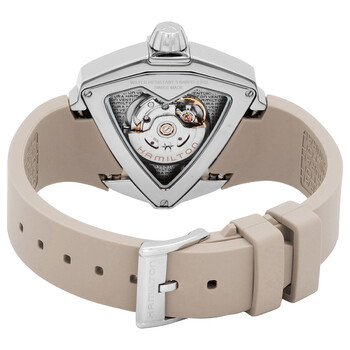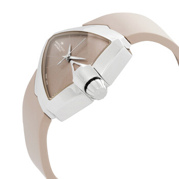 Silver-tone stainless steel case with a taupe rubber strap. Fixed silver-tone stainless steel bezel. Taupe dial with silver-tone hands and index hour markers. Dial Type: Analog. Caliber C26.101 automatic movement. Scratch resistant sapphire crystal. Pull / push crown. Solid case back. Triangle case shape, case size: 34.5 x 38 mm. Band width: 16 mm. Tang clasp. Water resistant at 50 meters / 165 feet. Functions: hour, minute, second. Ventura Series. Casual watch style. Watch label: Swiss Made. Hamilton Ventura Automatic Taupe Dial Men's Watch H24105370.