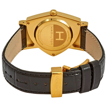 Yellow gold-tone stainless steel case with a black leather strap. Fixed yellow gold-tone stainless steel bezel. Black dial with luminous yellow gold-tone dauphine-style shape hands and dot hour markers. Dial Type: Analog. ETA Caliber F05.111 quartz movement with an 80-hour power reserve. Scratch resistant mineral crystal. Pull / push crown. Solid case back. Asymmetric case shape, case size: 32.3 mm x 50.3 mm, case thickness: 9.27 mm. Band width: 17 mm. Deployment clasp. Water resistant at 50 meters / 165 feet. Functions: hour, minute, second. Ventura Series. Sport watch style. Watch label: Swiss Movt. Hamilton Ventura Black Dial Asymmetric Ladies Watch H24301731.