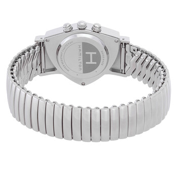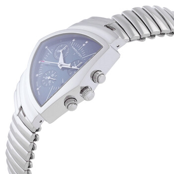 Silver-tone stainless steel case and bracelet. Fixed silver-tone stainless steel bezel. Blue dial with silver-tone hands and index hour markers. Minute markers around the outer rim. Dial Type: Analog. Date display between 4 and 5 o'clock position. Chronograph - three sub-dials displaying: 60 second, 30 minute and 1/10th of a second. ETA Caliber 251.474 quartz movement. Scratch resistant sapphire crystal. Pull / push crown. Solid case back. Unique case shape, case size: 32.3 x 50.3 mm, case thickness: 10.87 mm. Band width: 17 mm. Water resistant at 50 meters / 165 feet. Functions: chronograph, date, hour, minute, small second. Ventura Series. Watch label: Swiss Made. Hamilton Ventura Chronograph Quartz Blue Dial Watch H24432141.