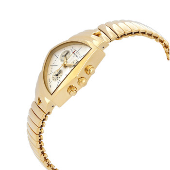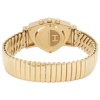 Gold-tone PVD stainless steel case and bracelet. Fixed bezel. Silver dial with gold-tone hands and index hour markers. Dial Type: Analog. Date display at the 4 o'clock position. Chronograph - three sub-dials displaying: 60 second, 30 minute and 12 hours. Caliber 251.474 quartz movement. Pull / push crown. Solid case back. Triangle case shape, case size: 32,3mm x 50,3mm. Band width: 17 mm. Deployment clasp. Water resistant at 50 meters / 165 feet. Functions: chronograph, date, hour, minute, second. Ventura Series. Watch label: Swiss Made. Hamilton Ventura Chronograph Quartz Silver Dial Men's Watch H24422151.