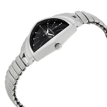 Stainless steel case with a stainless steel expansion bracelet. Fixed stainless steel bezel. Black dial with silver-tone dauphine-style shape hands and index hour markers. Dial Type: Analog. ETA caliber F05.111 quartz movement. Scratch resistant mineral crystal. Pull / push crown. Solid case back. Asymmetric case shape. Case dimensions: 50.3 mm x 32.3 mm. Case thickness: 9.27 mm. Band width: 17 mm. Water resistant at 50 meters / 165 feet. Functions: hour, minute, second. Ventura L Series. Dress watch style. Watch label: Swiss Movt. Hamilton Ventura L Black Dial Asymmetric Men's Watch H24411232.