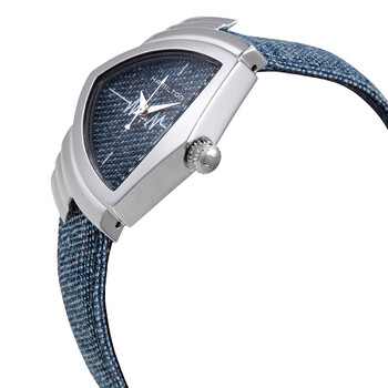 Stainless steel case with a blue denim strap. Fixed stainless steel bezel. Blue (denim) dial with silver-tone hands. Index markers at the 3, 6, 9 and 12 o'clock positions. Dial Type: Analog. ETA caliber F03.101 quartz movement. Scratch resistant mineral crystal. Pull / push crown. Solid case back. Asymmetric case shape. Case dimensions: 24 mm x 36.5 mm. Band width: 12 mm. Tang clasp. Water resistant at 50 meters / 165 feet. Functions: hour, minute, second. Ventura Series. Dress watch style. Hamilton Ventura Quartz Blue Denim Dial Ladies Watch H24211941.