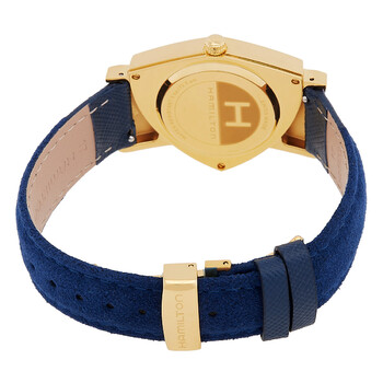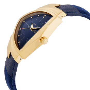 Gold-tone PVD stainless steel case with a blue textile strap. Fixed gold-tone PVD stainless steel bezel. Blue dial with gold-tone hands and index hour markers. Dial Type: Analog. Caliber F05.115 quartz movement. Scratch resistant mineral crystal. Pull / push crown. Solid case back. Unique case shape, case size: 32.3 x 50.3 mm, case thickness: 9.27 mm. Band width: 17 mm. Butterfly clasp. Water resistant at 50 meters / 165 feet. Functions: hour, minute, second. Ventura Series. Watch label: Swiss Made. Hamilton Ventura Quartz Blue Dial Watch H24301941.
