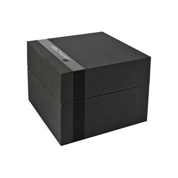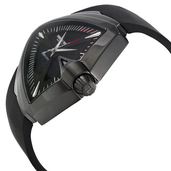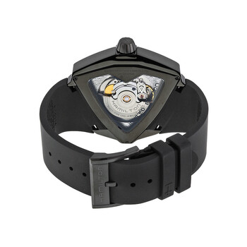Asymmetric gunmetal PVD stainless steel case with a black rubber strap. Fixed gunmetal PVD bezel. Black dial with luminous hands and stick hour markers. Minute markers around the outer rim. Dial Type: Analog. Luminescent hands. Self winding automatic movement with a 38 hour power reserve. Scratch resistant sapphire crystal. Skeleton case back. Case diameter: 46 mm. Case thickness: 13 mm. Triangle case shape. Band length: 8.5 inches. Fold over clasp. Water resistant at 50 meters / 165 feet. Functions: hours, minutes, seconds. Fashion watch style. Watch label: Swiss Made. Hamilton Ventura XXL Elvis Anniversary Men's Watch H24615331.