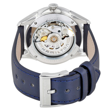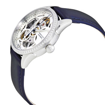Stainless steel case with a blue satin strap. Fixed stainless steel bezel set with 68 diamonds. White mother of pearl skeleton dial with luminous silver-tone hands and index hour markers. Minute markers around the outer rim. Dial Type: Analog. Luminescent hands. Hamilton calibre H-20-S automatic movement with a 40-hour power reserve. Scratch resistant sapphire crystal. Pull / push crown. Transparent case back. Case size: 36 mm. Case thickness: 10 mm. Round case shape. Band width: 18 mm. Tang clasp. Water resistant at 50 meters / 165 feet. Functions: hour, minute, second. Additional Info: 68 diamonds on bezel. Luxury watch style. Watch label: Swiss Made. Hamilton White Mother of Pearl Skeleton Dial Ladies Watch H42405991.