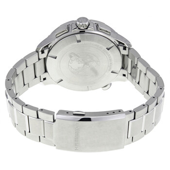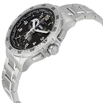 Stainless steel case with a stainless steel bracelet. Uni-directional rotating stainless steel bezel. Black dial with luminous silver-tone hands and Arabic numeral hour markers. Minute markers. World time cities around the outer rim. Dial Type: Analog. Luminescent hands. Date display at the 6 o'clock position. Chronograph - two sub-dials displaying: 60 second and 120 minute. Quartz movement. Scratch resistant sapphire crystal. Pull / push crown. Solid case back. Case size: 45 mm. Case thickness: 13 mm. Round case shape. Band width: 22 mm. Fold over clasp. Water resistant at 100 meters / 330 feet. Functions: chronograph, date, hour, minute, second. Luxury watch style. Watch label: Swiss Made. Hamilton Worldtimer Chronograph Black Dial Men's Watch H76714135.