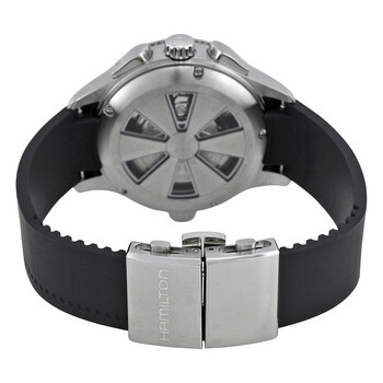 Stainless steel case with a black rubber strap. Fixed stainless steel bezel. Silver dial with silver-tone hands and index hour markers. Minute markers. Nautical scale markers around the outer rim. Dial Type: Analog. Luminescent hands and markers. Day of the week and date display at the 3 o'clock position. Chronograph - two sub-dials displaying: 60 second and 30 minute. Automatic movement. Scratch resistant sapphire crystal. Solid case back. Case diameter: 42 mm. Round case shape. Band width: 20 mm. Tang clasp. Water resistant at 100 meters / 330 feet. Casual watch style. Hamilton X-Patrol Chronograph Automatic Men's Watch H76566351.