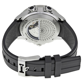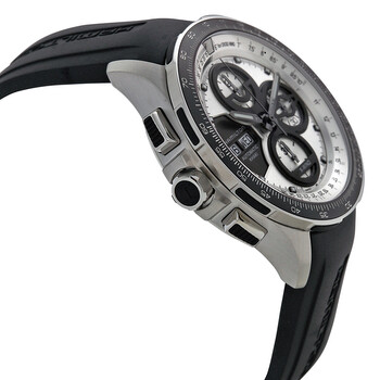 Stainless steel case with a black rubber strap. Bidirectional black top ring bezel. Silver dial with luminous hands and index hour markers. Minute markers. Aviation calculation markers around the outer rim. Dial Type: Analog. Luminescent hands and markers. Day of the week and date display at the 9 o'clock position. Chronograph - three sub-dials displaying: 60 second, 30 minute and 12 hour. Automatic movement with a 70-hour power reserve. Scratch resistant sapphire crystal. Screw down crown. Transparent case back. Case diameter: 45 mm. Case thickness: 16 mm. Round case shape. Band width: 22 mm. Tang clasp. Water resistant at 100 meters / 330 feet. Functions: date, day, hour, minute, second. Casual watch style. Hamilton X-Wind Khaki Automatic Chronograph Silver Dial Black Rubber Men's Watch H77726351.