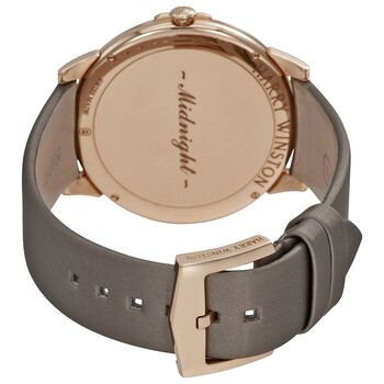 Rose gold-tone 18 kt rose gold case set with diamonds case with a grey satin bracelet. Fixed bezel set with diamonds rose gold-tone 18 kt rose gold bezel. Champagne sunray dial with rose gold-tone hands and stick hour markers. Diamonds mark the 3, 6, 9 and 12 o'clock positions. Dial Type: Analog. Quartz movement. Scratch resistant sapphire crystal. Pull / push crown. Case size: 39 mm. Round case shape. Tang clasp. Water resistant at 30 meters / 100 feet. Functions: hour, minute. Additional Info: diamond weight: 0.95 ct. Luxury watch style. Watch label: Swiss Made. Harry Winston Midnight Champagne Sunray Dial 18kt Rose Gold Diamond Satin Ladies Watch MIDQHM39RR002.