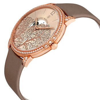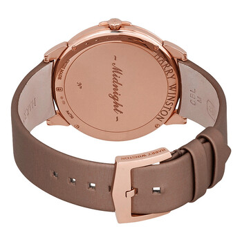 18kt rose gold case set with diamonds case with a satin strap. Fixed bezel set with diamonds. Champagne sunray dial with gold-toned hands and index hour markers. Dial Type: Analog. Quartz movement. Scratch resistant sapphire crystal. Pull / push crown. Case diameter: 39 mm. Round case shape. Tang clasp. Water resistant at 30 meters / 100 feet. Functions: hour, minute, moonphase. Additional Info: diamond weight: 0.96 ct. Luxury watch style. Watch label: Swiss Made. Harry Winston Midnight Champagne Sunray Dial 18kt Rose Gold Diamond Satin Unisex Watch MIDQMP39RR001.