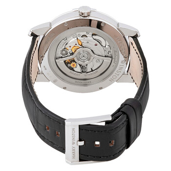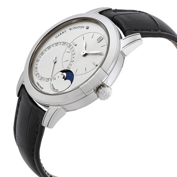 18kt white gold case with a black alligator leather strap. Fixed 18kt white gold bezel. Silver-tone dial with silver-tone leaf-style shape hands and index hour markers. Dial Type: Analog. Date display at the 7 o'clock position. Two sub-dials displaying: date and moon phase. Harry Winston Calibre HW3203 Automatic movement, containing 28 Jewels, bitting at 28800 vph, and has a power reserve of approximately 68 hours. Scratch resistant sapphire crystal. Transparent see through case back. Round case shape, case size: 42 mm, case thickness: 10.2 mm. Pin buckle clasp. Water resistant at 30 meters / 100 feet. Functions: date, hour, minute, moon phase. Midnight Series. Luxury watch style. Watch label: Swiss Made. Harry Winston Midnight Silver Dial Automatic Men's Moon Phase Watch MIDAMP42WW003.