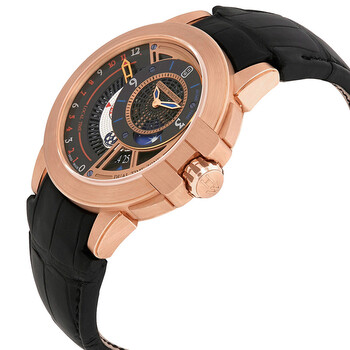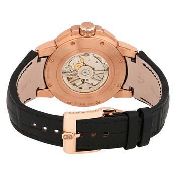 Rose gold-tone 18 carat rose gold case with a black alligator leather strap. Fixed rose gold-tone 18 carat rose gold bezel. Black dial with rose gold-tone hands and index-Arabic numerals hour markers. Dial Type: Analog. Harry Winston Calibre HW3502 automatic movement with a 72-hour power reserve. Scratch resistant sapphire crystal. Case size: 44 mm. Round case shape. Water resistant at 100 meters / 330 feet. Functions: excentered hours, minute, day/night indicator, retrograde second time-zone, date. Luxury watch style. Watch label: Swiss Made. Harry Winston Ocean Dual Time Black Dial Automatic Men's Watch OCEATZ44RR011.