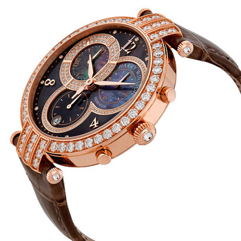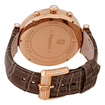 Rose gold-tone 18 carat rose gold case with a taupe alligator leather strap. Fixed-diamond set rose gold-tone 18 carat rose gold bezel. Tahitian mother of pearl dial with rose gold-tone hands and Arabic-diamond numeral hour markers. Dial Type: Analog. Date display at the 6 o'clock position. Chronograph - three sub-dials displaying: 60 second, 30 minute and 12 hours. Harry Winston Calibre HW5202 quartz movement. Scratch resistant sapphire crystal. Case size: 40 mm. Round case shape. Water resistant at 30 meters / 100 feet. Functions: chronograph, date, hour, minute, second. Additional Info: watch set with 236 diamonds (~3.47 carats). Luxury watch style. Watch label: Swiss Made. Harry Winston Premier Men's Chronograph Watch PRNQCH40RR002.
