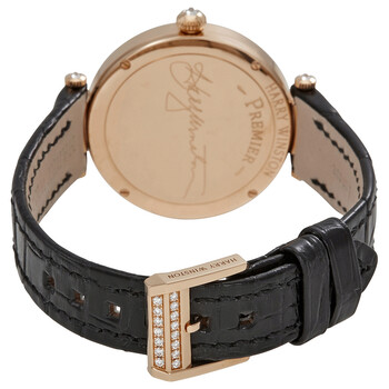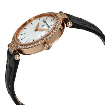 Rose gold-tone 18 carat rose gold case with a black alligator leather strap. Fixed-diamond set rose gold-tone 18 carat rose gold bezel. White mother of pearl dial with rose gold-tone hands and index hour markers. Dial Type: Analog. Harry Winston Calibre HW5002 quartz movement. Scratch resistant sapphire crystal. Case size: 31 mm. Round case shape. Water resistant at 30 meters / 100 feet. Functions: hour, minute. Luxury watch style. Watch label: Swiss Made. Harry Winston Premier White Mother Of Pearl Dial Ladies Watch PRNQHM31RR001.